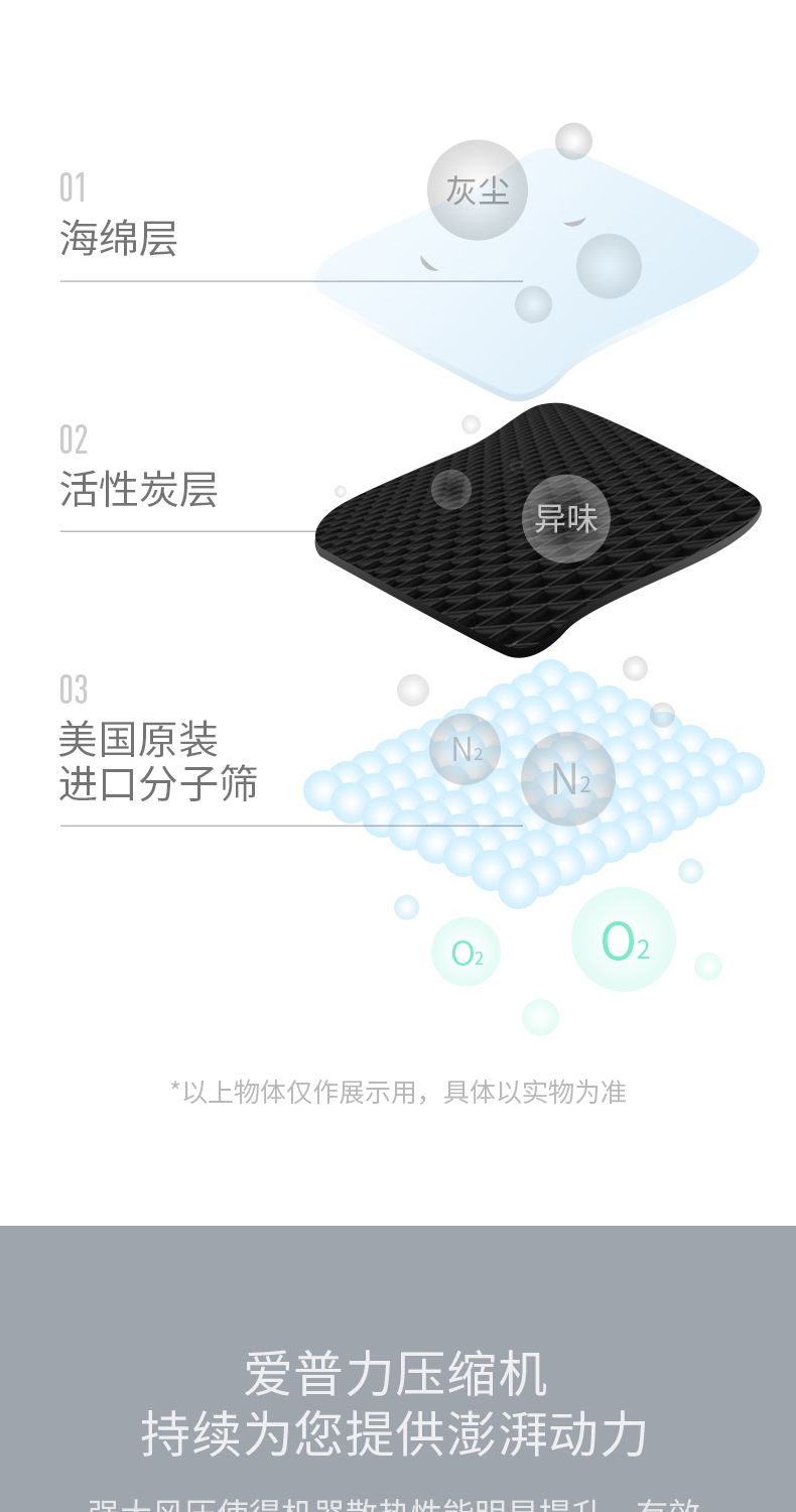 以空氣為原料,用物理的變壓吸附法,將空氣中的氧氣與氮氣分離,濾除空氣中的雜質,從而獲取符合醫(yī)用氧標準的高純度氧氣。